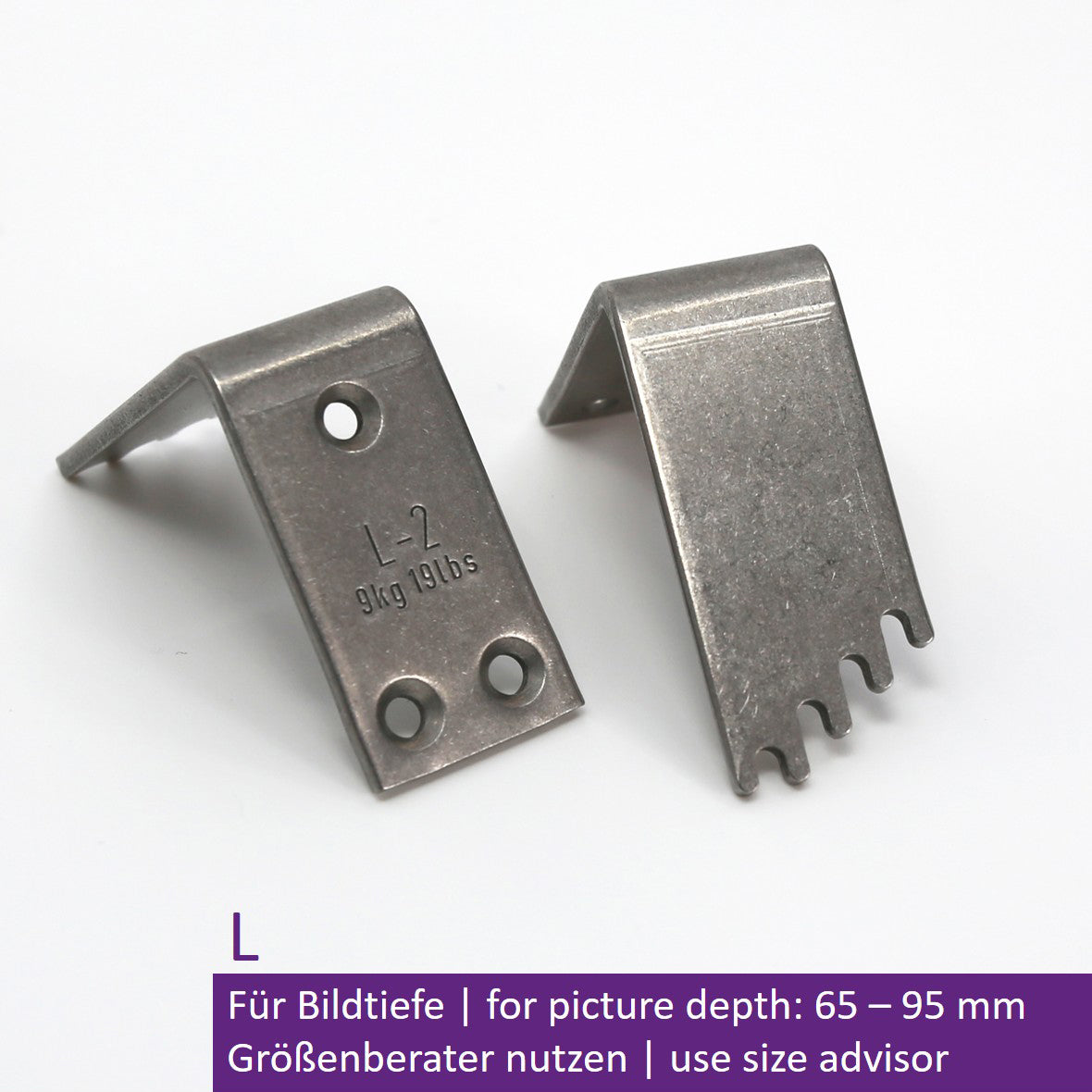 For picture depths of 65–95 mm, max. load 2 x 9 kg (18 kg), made of stainless steel, weight: 75 g, dimensions (H x W x L): 40 x 20 x 44 mm