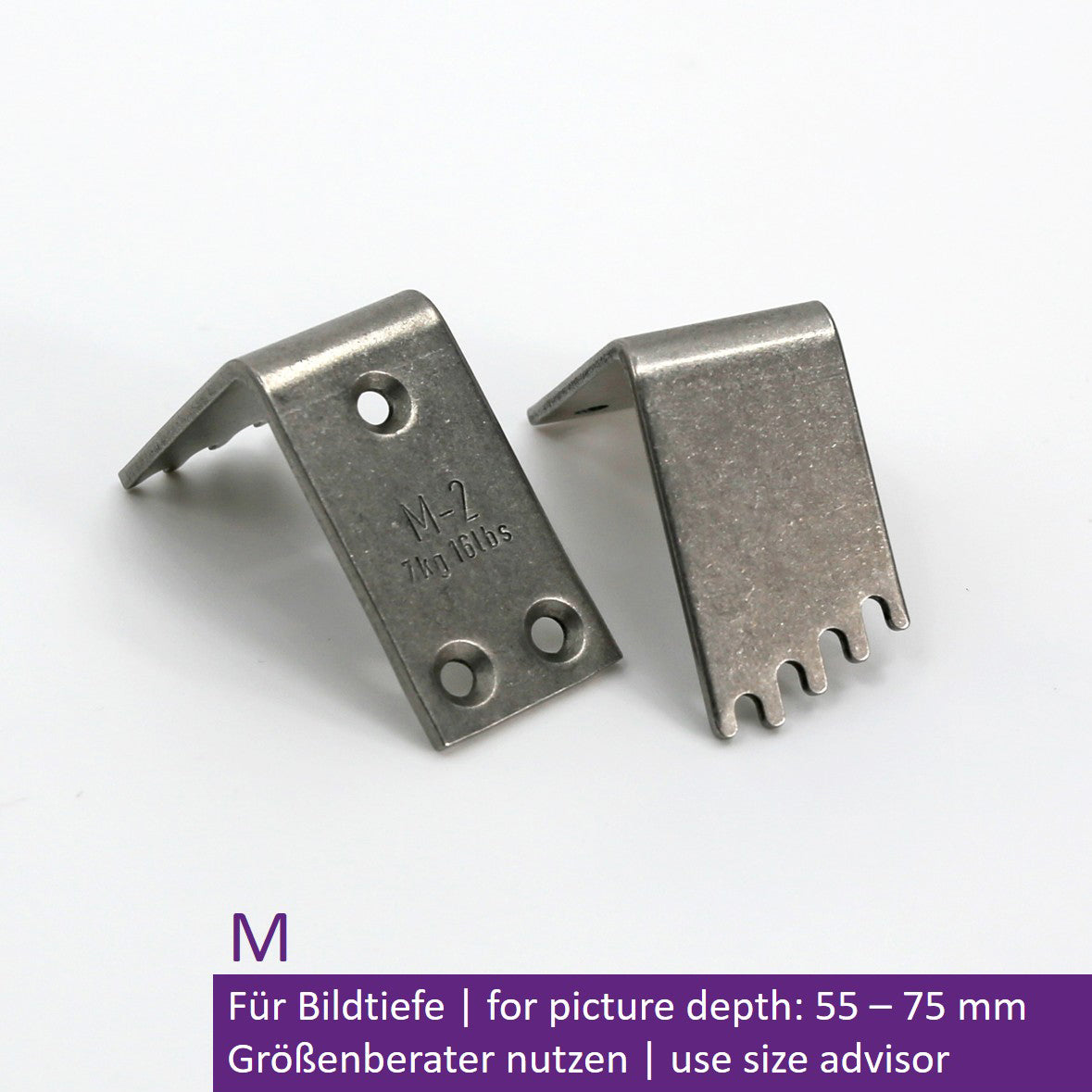 For picture depths of 55–75 mm, max. load 2 x 7 kg (14 kg), made of stainless steel, weight: 57 g, dimensions (H x W x L): 40 x 20 x 35 mm