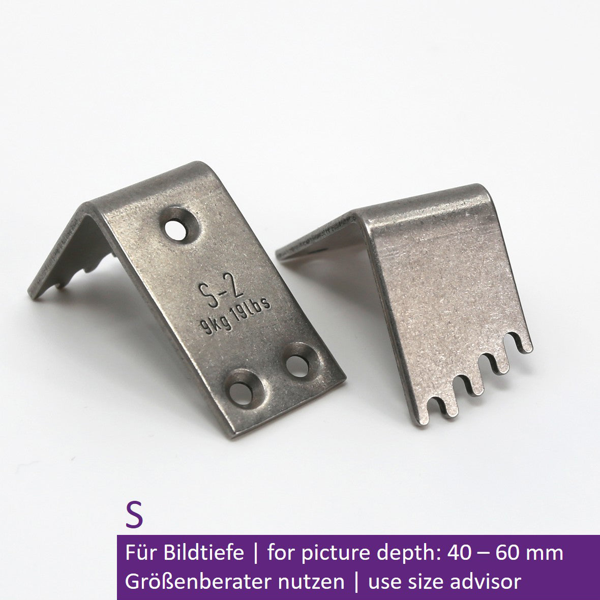 For picture depths of 40–60 mm, max. load 2 x 9 kg (18 kg), made of stainless steel, weight: 51 g, dimensions (H x W x L): 40 x 20 x 29 mm