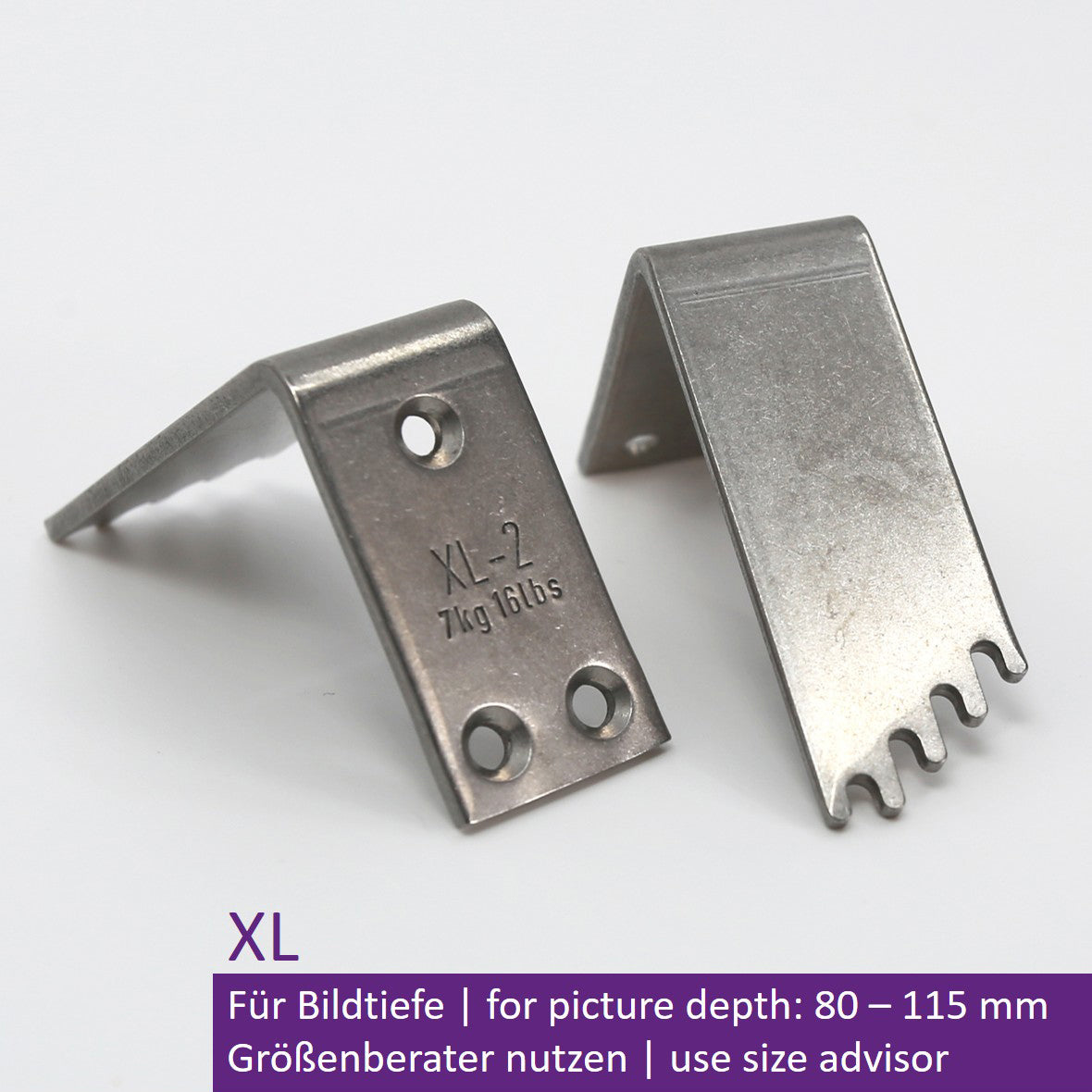 For picture depths of 80–115 mm, max. load 2 x 7 kg (14 kg), made of stainless steel, weight: 79 g, dimensions (H x W x L): 40 x 20 x 53 mm