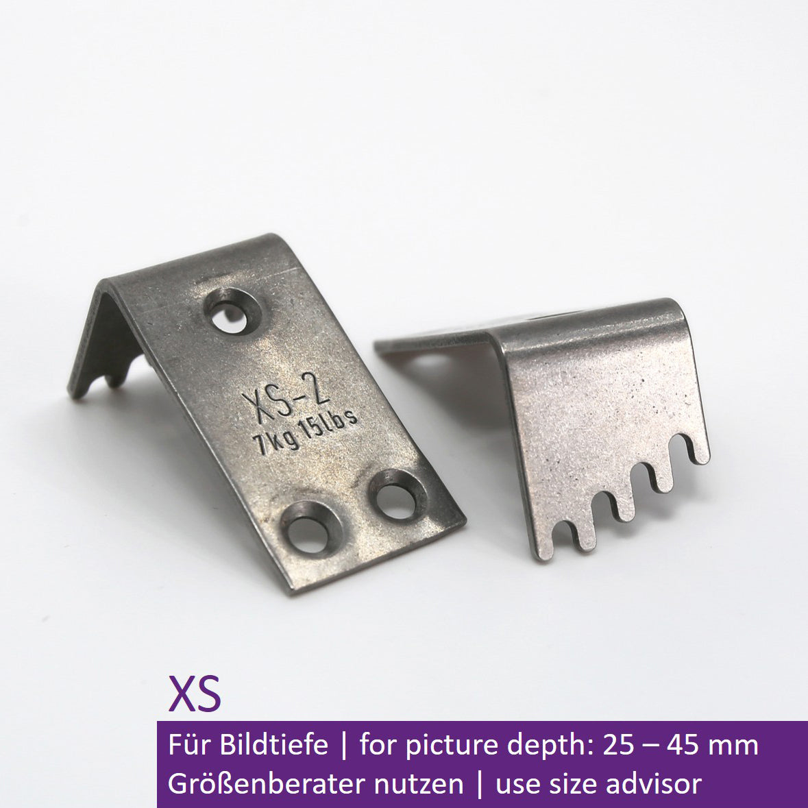 For picture depths of 25–45 mm, max. load 2 x 7 kg (14 kg), made of stainless steel, weight: 38 g, dimensions (H x W x L): 40 x 20 x 21 mm