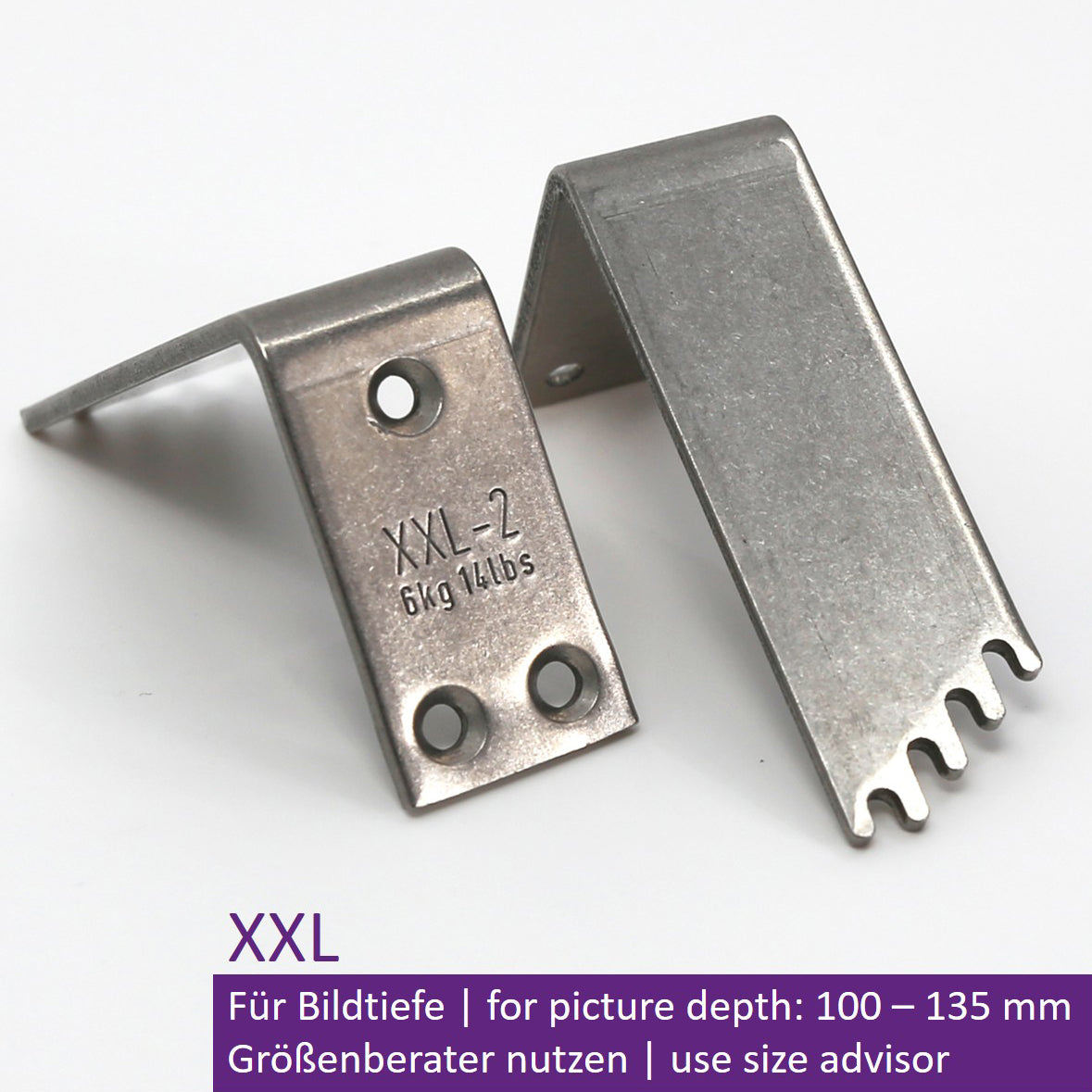 For picture depths of 100–135 mm, max. load 2 x 6 kg (12 kg), made of stainless steel, weight: 88 g, dimensions (H x W x L): 40 x 20 x 62 mm