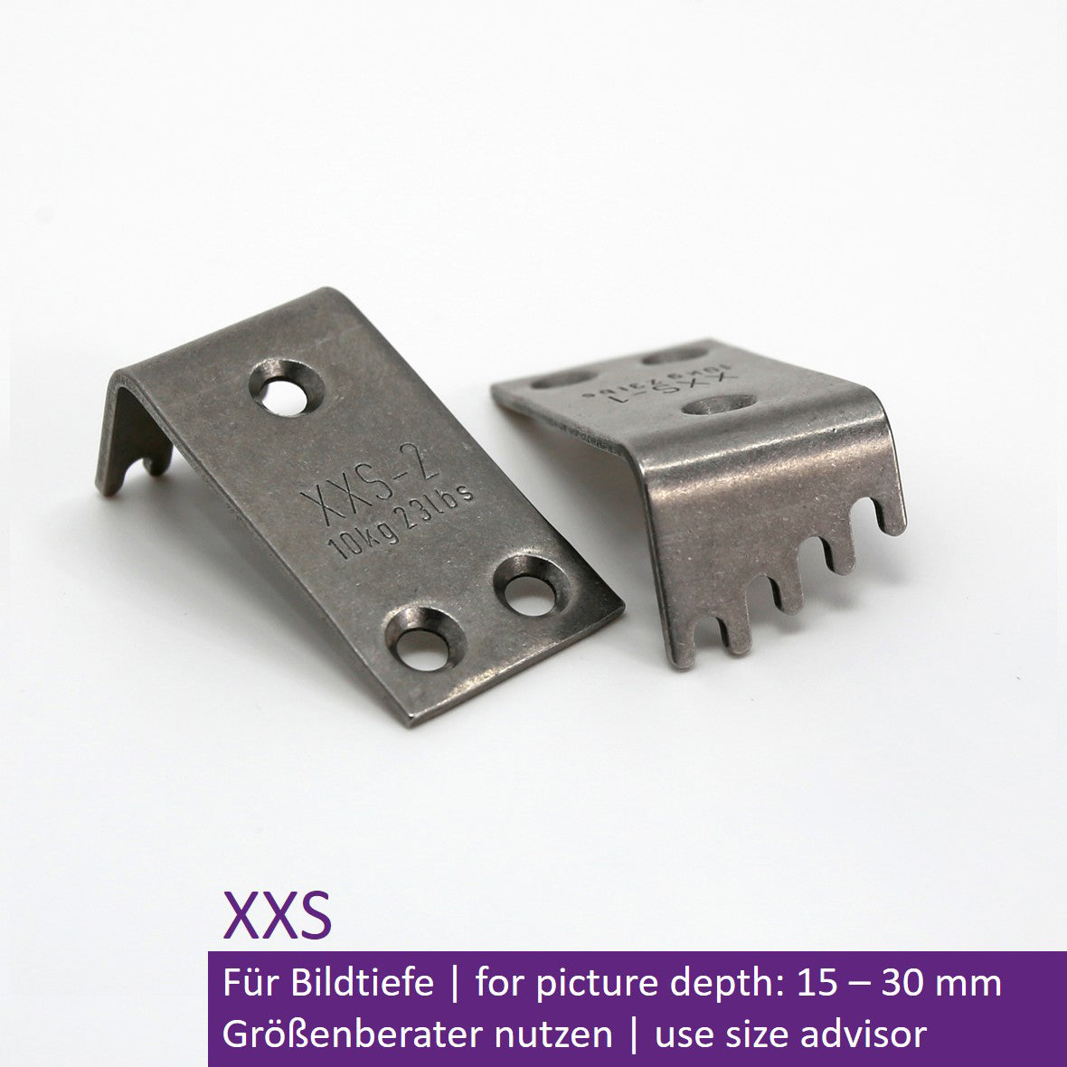 For picture depths of 15–30 mm, max. load 2 x 10 kg (20 kg), made of stainless steel, weight: 34 g, dimensions (H x W x L): 40 x 20 x 15 mm