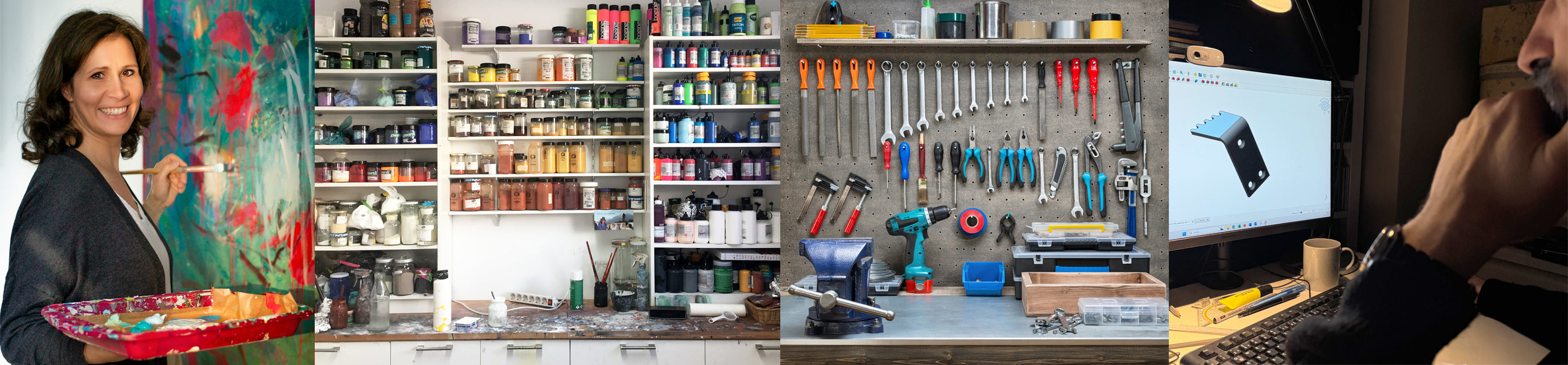 Seit über 20 Jahren sind Katja und Jens ein eingespieltes Team: Katja ist seit 2001 im Bereich Kunst tätig und präsentiert seit 2014 ihre Bilder national und international. Jens unterstützt sie dabei, hilft zum Beispiel beim Rahmenbau für die Gemälde, beim Bau von Transportboxen, beim Keilrahmenbau, beim Bildertransport, beim Anbringen der Kunstwerke beim Kunden oder auch beim Hängen der Bilder in Galerien und auf Kunstmessen.