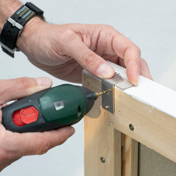 Dem Produkt liegen vier kurze Schrauben zum Befestigen der Winkel am Bild bei, ein wiederverwendbares Unterlegplättchen, um den korrekten Abstand von 2,5mm zwischen Bildoberseite und Winkel einzustellen sowie zwei längere Schrauben. Schraubendreher oder Akkuschrauber mit Innensechsrund der Größe T10. Zum Markieren von Schraubenpositionen empfiehlt sich ein Bleistift zusammen mit einem Lineal, Maßband oder Maßstab. Eine Wasserwaage kann ebenfalls hilfreich sein. Die Montage des Systems ist Schritt für Schritt in der beiliegenden Gebrauchsanweisung beschrieben.