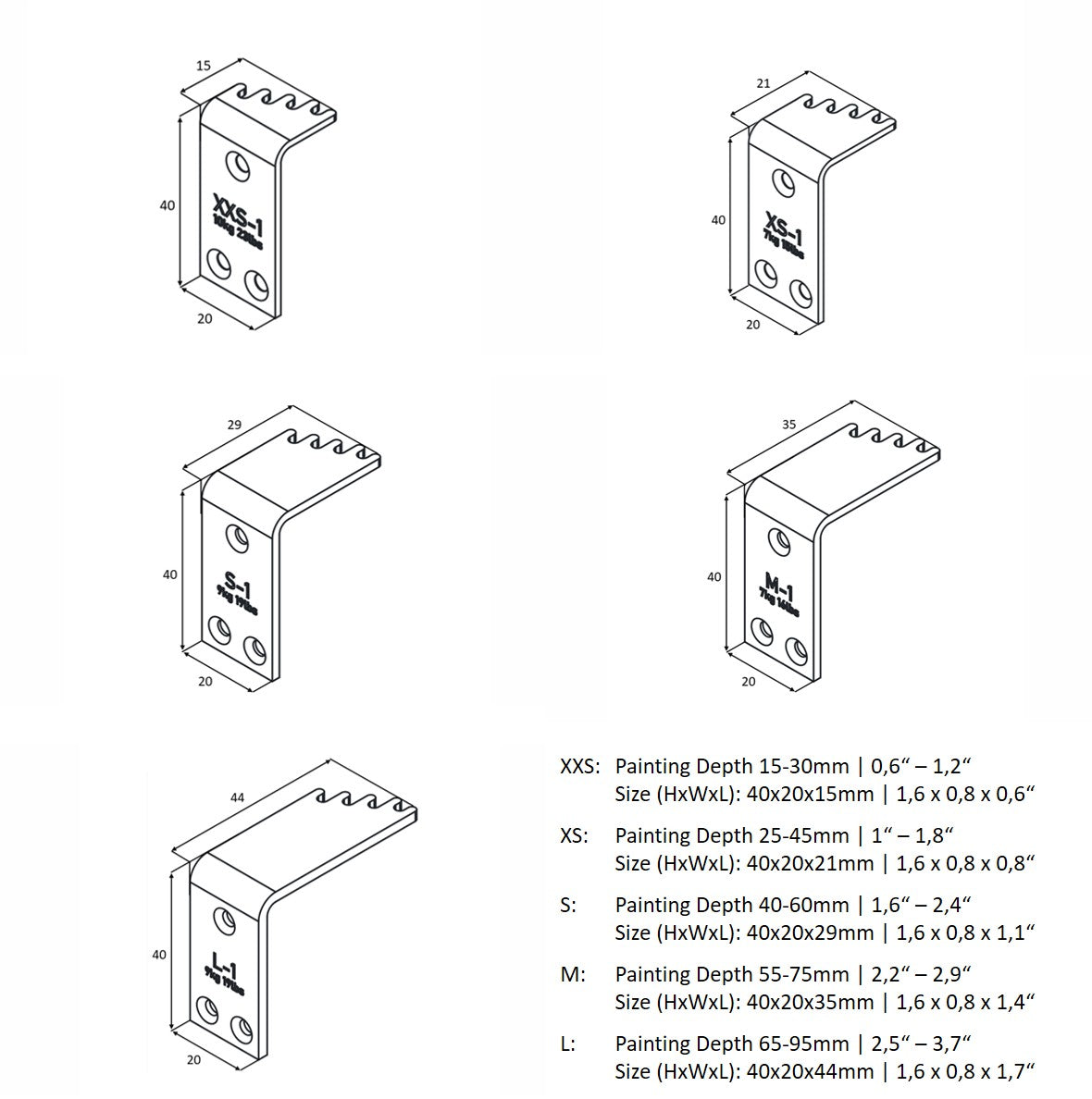 Mit dem Starter Kit immer den passenden Bigfoot für eine optimale Hängung zur Hand haben. Die 5 Größen von XXS bis L sind die am häufigsten gebrauchten Varianten, da sie insgesamt Bildtiefen von 15mm bis 95mm abdecken. Das heißt von sehr schmalen Leinwänden / Malgründen bis hin zu sehr tiefen Malgründen, Holzkörpern, Objektkästen etc.