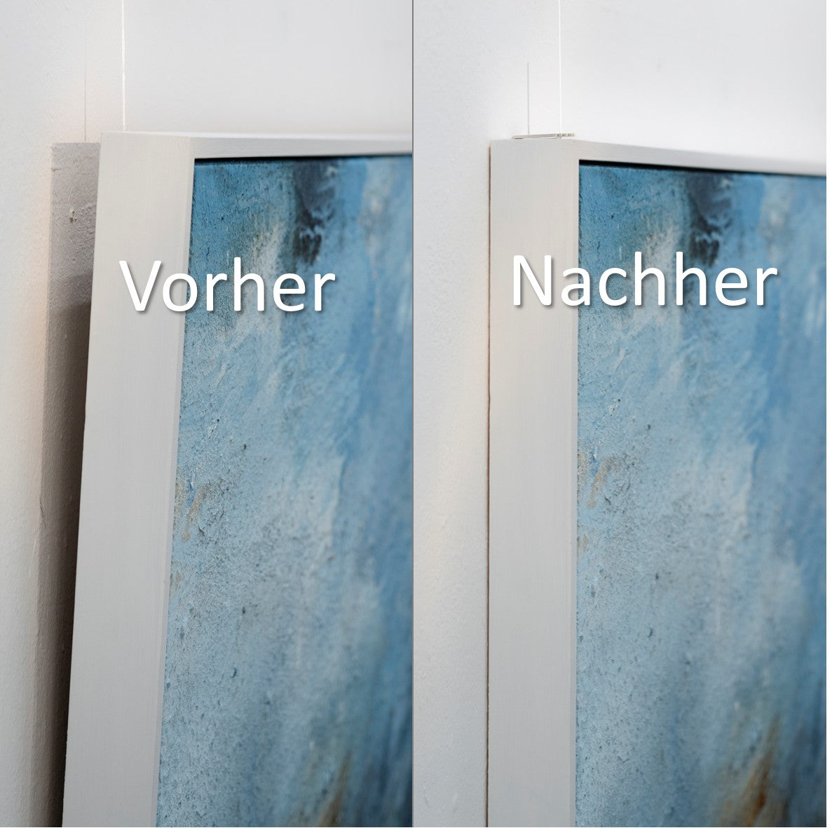 Er ersetzt kein Hängesystem, sondern optimiert die Aufhängung, damit Ihr Bild nicht mehr nach vorne kippt, sondern perfekt parallel zur Wand hängt.